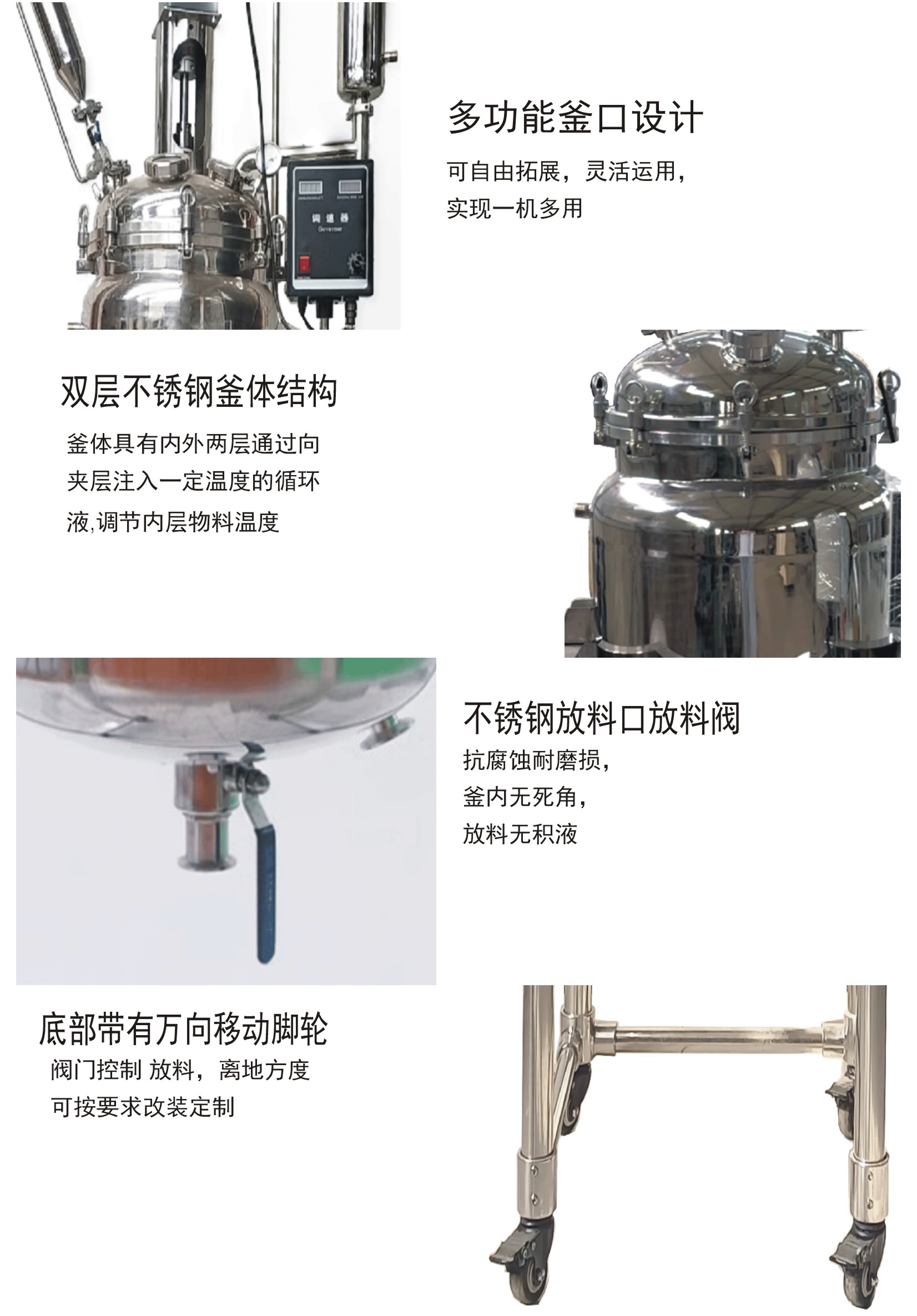 雙層不銹鋼反應(yīng)釜為雙層不銹鋼設(shè)計(jì),內(nèi)層放入反應(yīng)溶媒可做攪拌反應(yīng),夾層通上不同的冷熱源(冷凍液,熱水或熱油)做循環(huán)加熱或冷卻反應(yīng)。在設(shè)定恒溫條件下